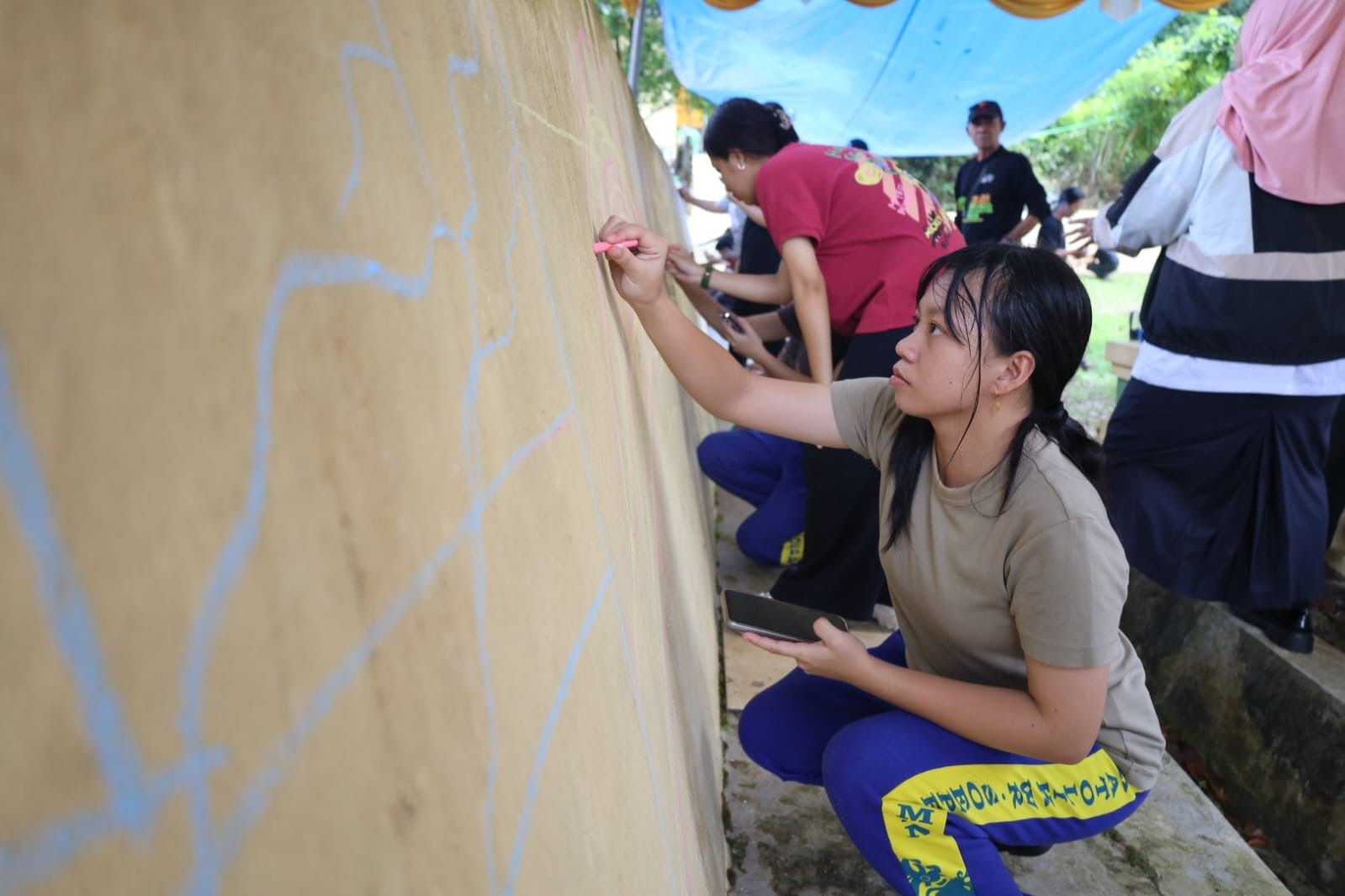 Para peserta dibagi dalam kelompok dengan tema berbeda—dari lukisan alam, budaya lokal, hingga landmark khas Kalimantan Timur. Dinding abu-abu di area taman pun berubah menjadi kanvas penuh warna yang memancarkan semangat muda.
