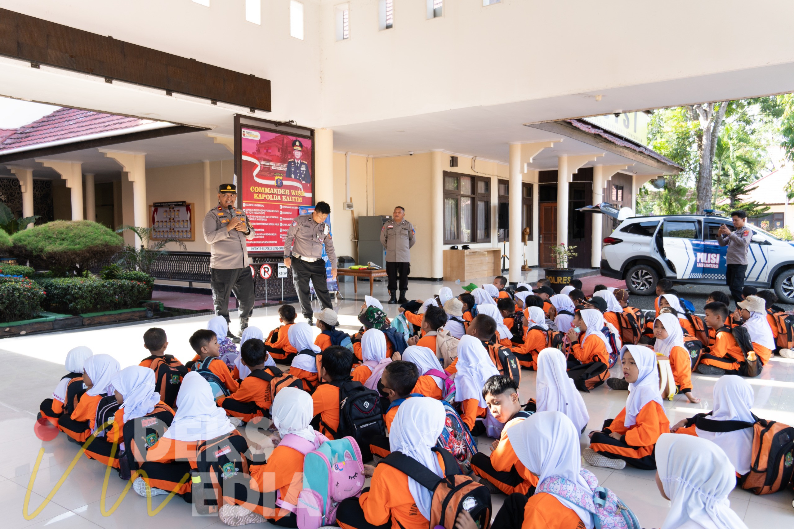 Sebanyak 74 siswa-siswi didampingi 10 guru diajak mengenal lingkungan Mako Polres Kutim, mulai dari fungsi dasar kepolisian, kendaraan dinas, rambu-rambu lalu lintas, hingga edukasi pencegahan perundungan (bullying) di lingkungan sekolah.