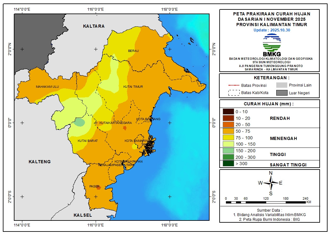 Prakiraan ini dirilis oleh BMKG Stasiun Meteorologi Aji Pangeran Tumenggung (APT) Pranoto Samarinda, berdasarkan pembaruan data terakhir pada 30 Oktober 2025.
