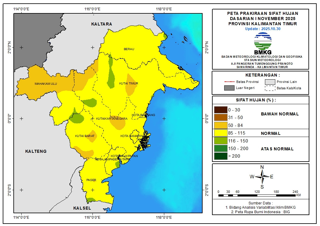 BMKG juga mencatat bahwa sifat hujan pada Dasarian I November 2025 di Kaltim secara umum tergolong normal (85–115%) hingga bawah normal (50–84%).