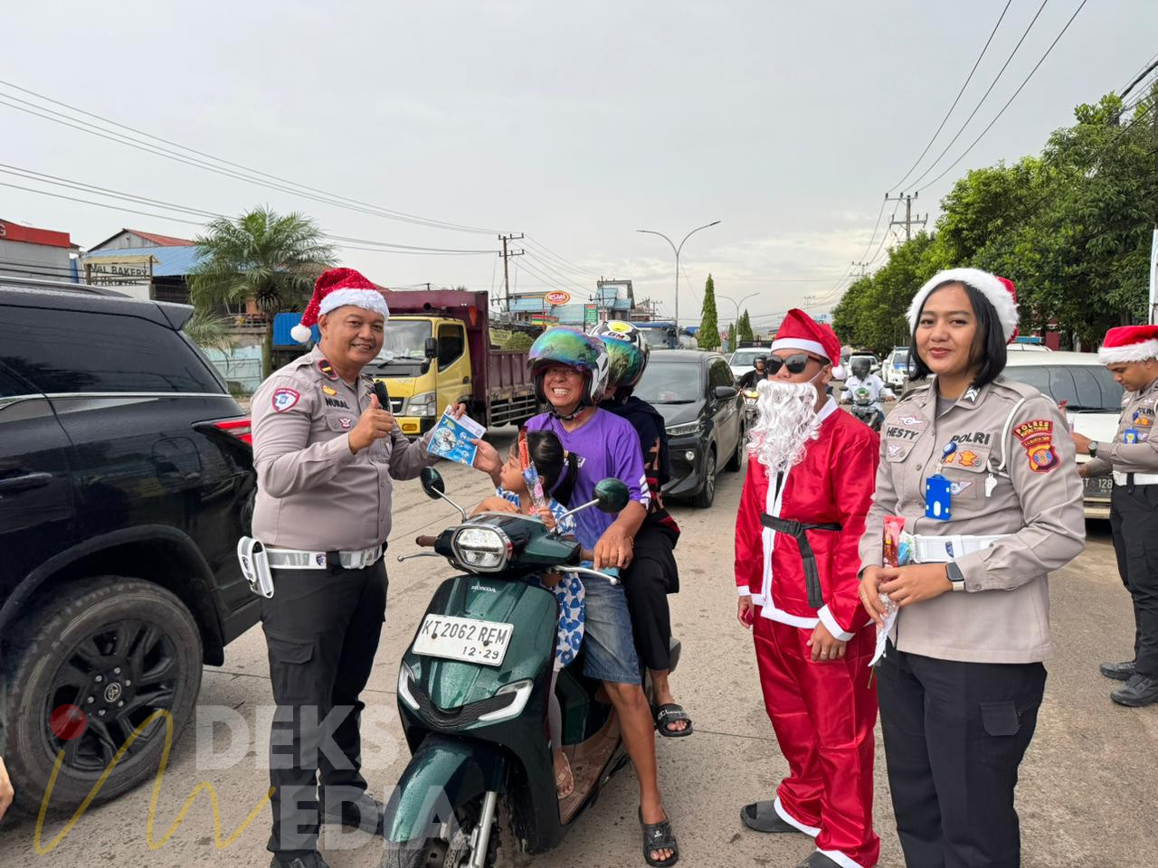 Personel Sat Lantas tampak mengenakan topi Santa Claus saat melakukan sosialisasi keselamatan berlalu lintas kepada pengendara roda dua dan roda empat. Aksi tersebut menarik perhatian pengguna jalan dan masyarakat sekitar, sekaligus menghadirkan suasana kebersamaan di momen Nataru.