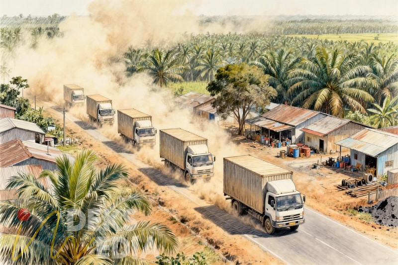 Ilustrasi buatan AI: konvoi truk memicu debu jalanan teterbangan ke udara. (dok Indeksmedia.ID)