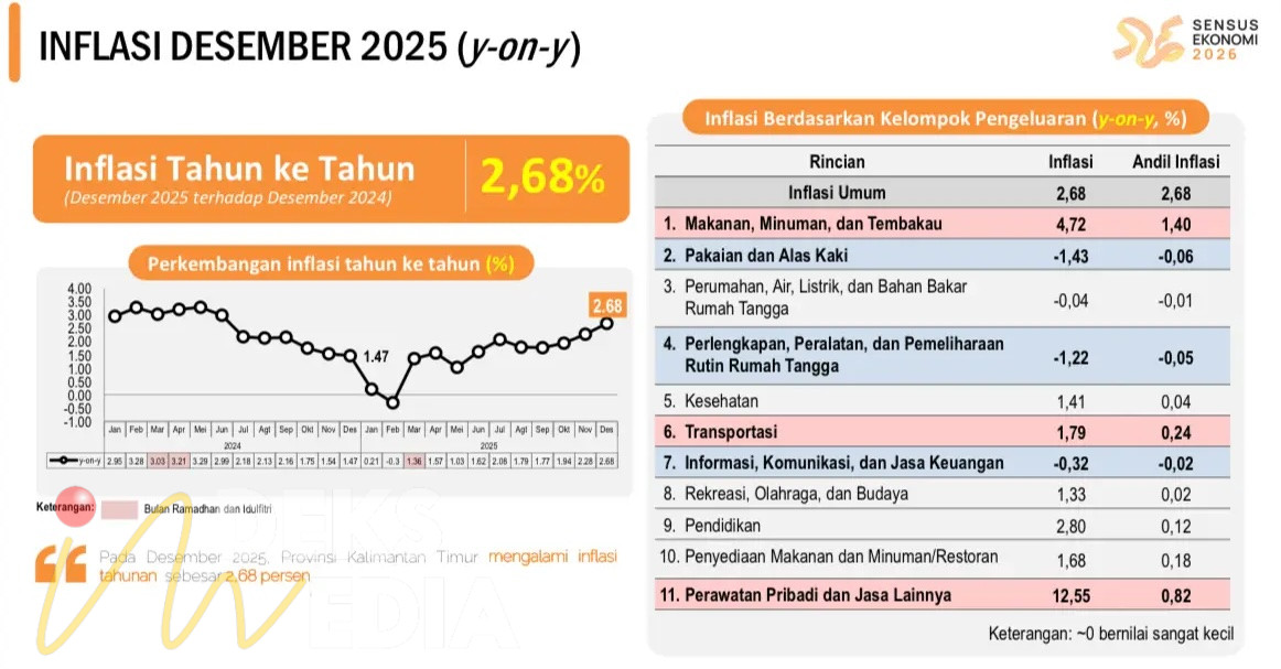 SAMARINDA, INDEKSMEDIA.ID — Badan Pusat Statistik (BPS) Provinsi Kalimantan Timur mencatat inflasi year on year (y-on-y) pada Desember 2025 sebesar 2,68 persen dengan Indeks Harga Konsumen (IHK) 109,80.