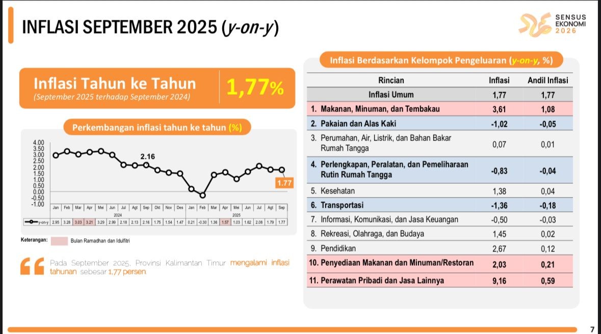 SAMARINDA, INDEKSMEDIA.ID — Badan Pusat Statistik (BPS) Provinsi Kalimantan Timur mencatat inflasi year on year (y-on-y) sebesar 1,77 persen dengan Indeks Harga Konsumen (IHK) 108,58 pada September 2025.