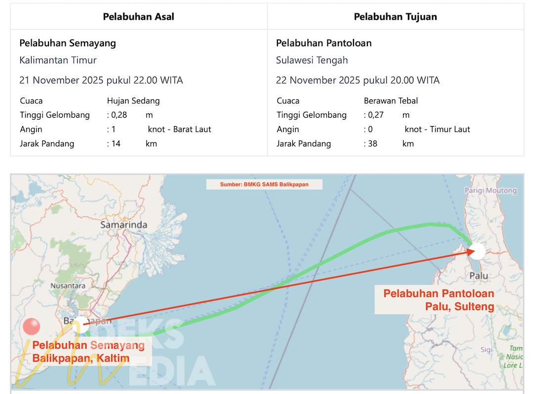 BALIKPAPAN, INDEKSMEDIA.ID – Badan Meteorologi, Klimatologi, dan Geofisika (BMKG) Stasiun Meteorologi Kelas I SAMS Sepinggan Balikpapan memprakirakan kondisi cuaca laut rute pelayaran Balikpapan, Kalimantan Timur (Kaltim) menuju Pantoloan, Sulawesi Tengah (Sulteng), yang dilintasi Kapal Motor (KM) Lambelu pada 21–22 November 2025, berada dalam kategori aman dengan gelombang rendah, meski hujan diperkirakan terjadi pada awal keberangkatan.