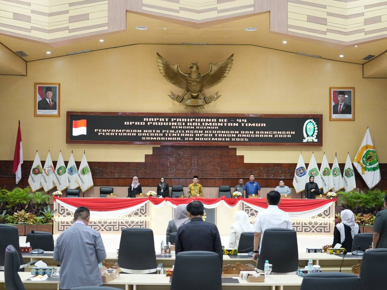 Penjelasan tersebut disampaikan Sekretaris Daerah Provinsi Kaltim, Sri Wahyuni, saat membacakan Nota Penjelasan Keuangan beserta Rancangan Peraturan Daerah tentang APBD 2026 pada Rapat Paripurna ke-44 DPRD Kaltim di Gedung Utama (B) DPRD Kaltim, Jalan Teuku Umar, Karang Paci, Samarinda, Sabtu (29/11/2025).