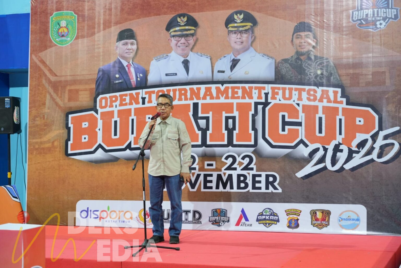 KUTIM,INDEKSMEDIA.ID – Bupati Kutai Timur (Kutim) H. Ardiansyah Sulaiman membuka Open Tournament Futsal Bupati Cup 2025 di GOR Kudungga, Kamis (13/11/2025) malam.