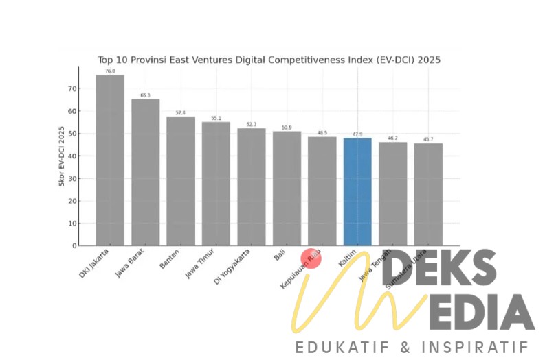SAMARINDA, INDEKSMEDIA.ID — Provinsi Kalimantan Timur (Kaltim) berhasil menembus 10 besar provinsi dengan daya saing digital tertinggi di Indonesia. Berdasarkan East Ventures Digital Competitiveness Index (EV-DCI) 2025, Kaltim meraih skor 47,9 dan menempati posisi kedelapan nasional, sekaligus tertinggi di kawasan Kalimantan.