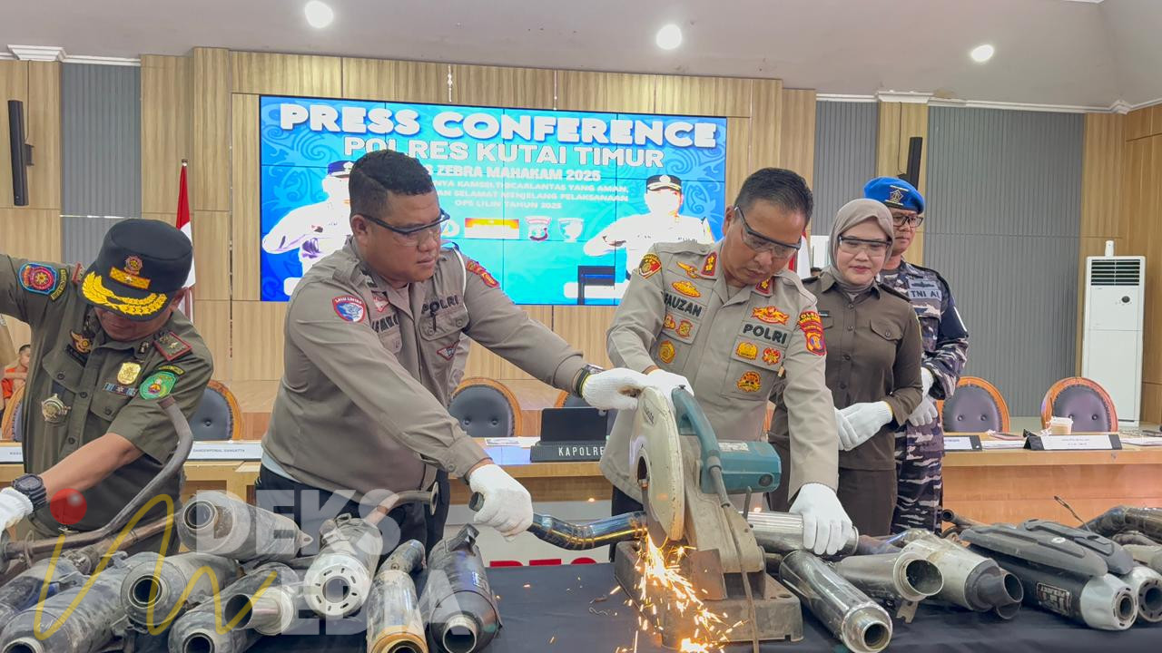 Kapolres Kutai Timur, AKBP Fauzan memusnahkan knalpot brong hasil operasi zebra mahakam 2025. (ft/indeksmedia)