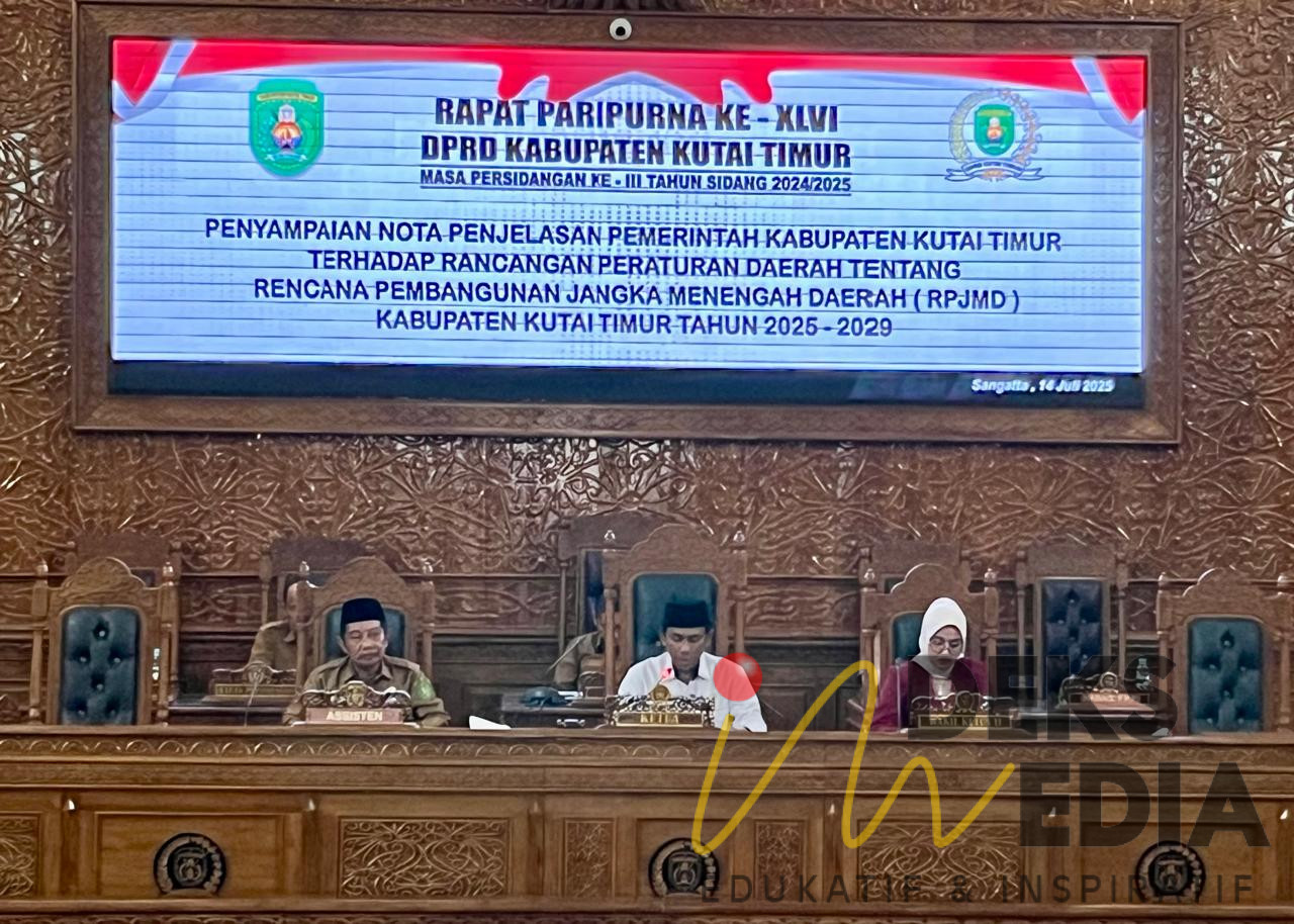 KUTIM,INDEKSMEDIA.ID – Dewan Perwakilan Rakyat Daerah (DPRD) Kabupaten Kutai Timur (Kutim) menggelar Rapat Paripurna ke-46 dengan agenda penyampaian Nota Penjelasan Pemerintah Kabupaten terhadap Rancangan Peraturan Daerah (Ranperda) tentang Rencana Pembangunan Jangka Menengah Daerah (RPJMD) Kutai Timur Tahun 2025-2029, Senin (14/7/2025).