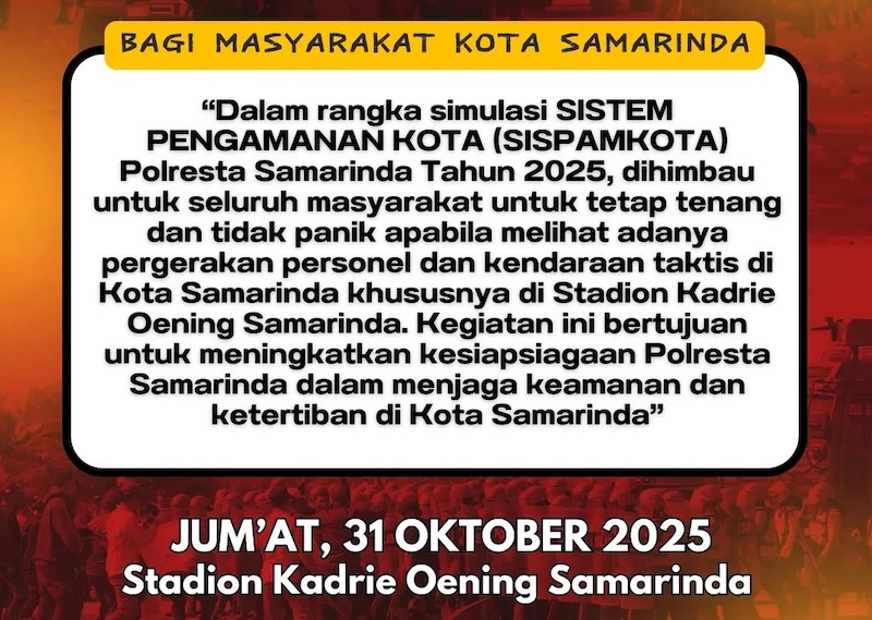“Dalam rangka simulasi Sispamkota Polresta Samarinda Tahun 2025, dihimbau untuk seluruh masyarakat tetap tenang dan tidak panik apabila melihat adanya pergerakan personel dan kendaraan taktis di Kota Samarinda, khususnya di Stadion Kadrie Oening,” demikian keterangan resmi Polresta Samarinda, Kamis (30/10/2025).