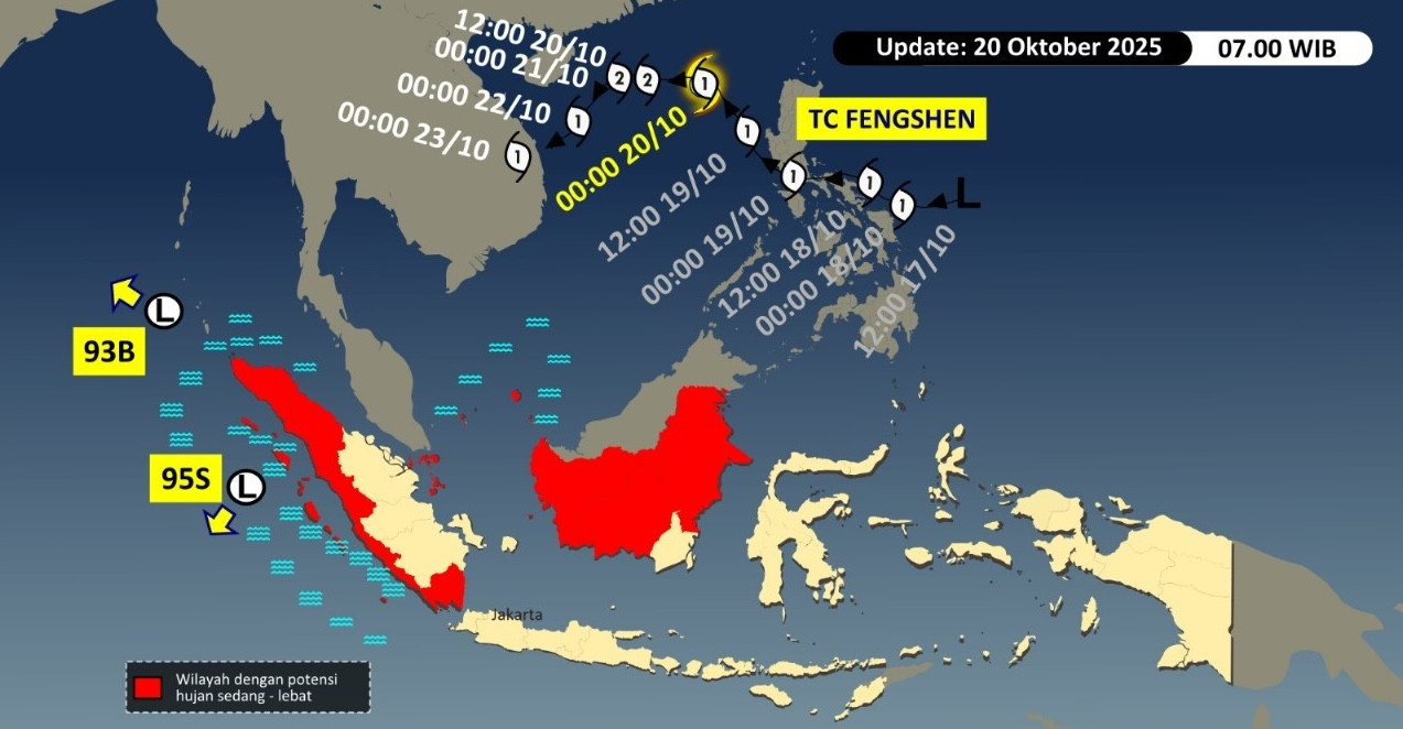 “Siklon Tropis Fengshen terbentuk dari bibit siklon 96W dan saat ini pusat sirkulasinya terpantau di Laut Filipina Barat, pada posisi 16,0° LU dan 118,8° BT atau sekitar 1.420 kilometer di utara Tarakan, Kalimantan Utara,” ujarnya, Senin (20/10/2025).