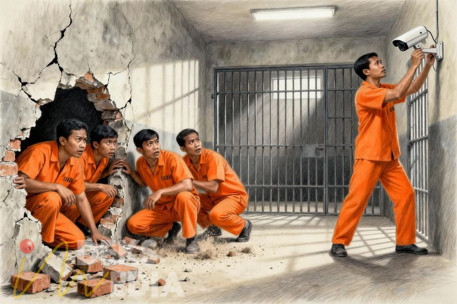 Ilustrasi buatan AI: para tahanan kabar dari sel penjara dengan cara jebol dinding dan sabotase kamera pengawas CCTV (Dok: Indeksmedia/AI)